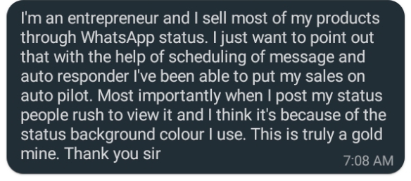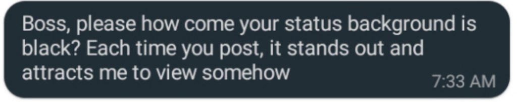 Whenever I update a status with a unique background colour, people jump on it immediately including those who don’t talk to me and I get questions like: please what kind of WhatsApp is this? Please sir how did you do it? People at least come to view the kind of background I used and end up reading my post, and that’s the big psychology behind selling (Being able to attract) When selling or trying to get people’s attention, you need something uniquely new and extraordinary. In retrospect, how exactly can you capture the attention of your WhatsApp audience, especially those who already muted or labelled you salesy. Pro tip: you shouldn’t look or sound salesy when selling!